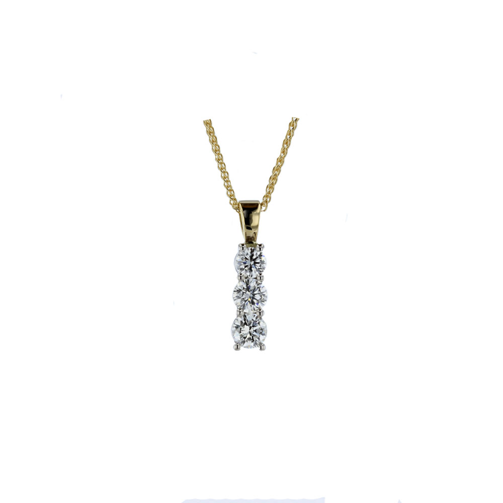 Three stone natural diamond pendant necklace set in white gold 0.20ct, 0.25ct & 0.30ct round brilliant cut diamonds. 18ct yellow gold bail and chain. Diamonds beautifully set in ascending sizes for spellbinding appeal.
