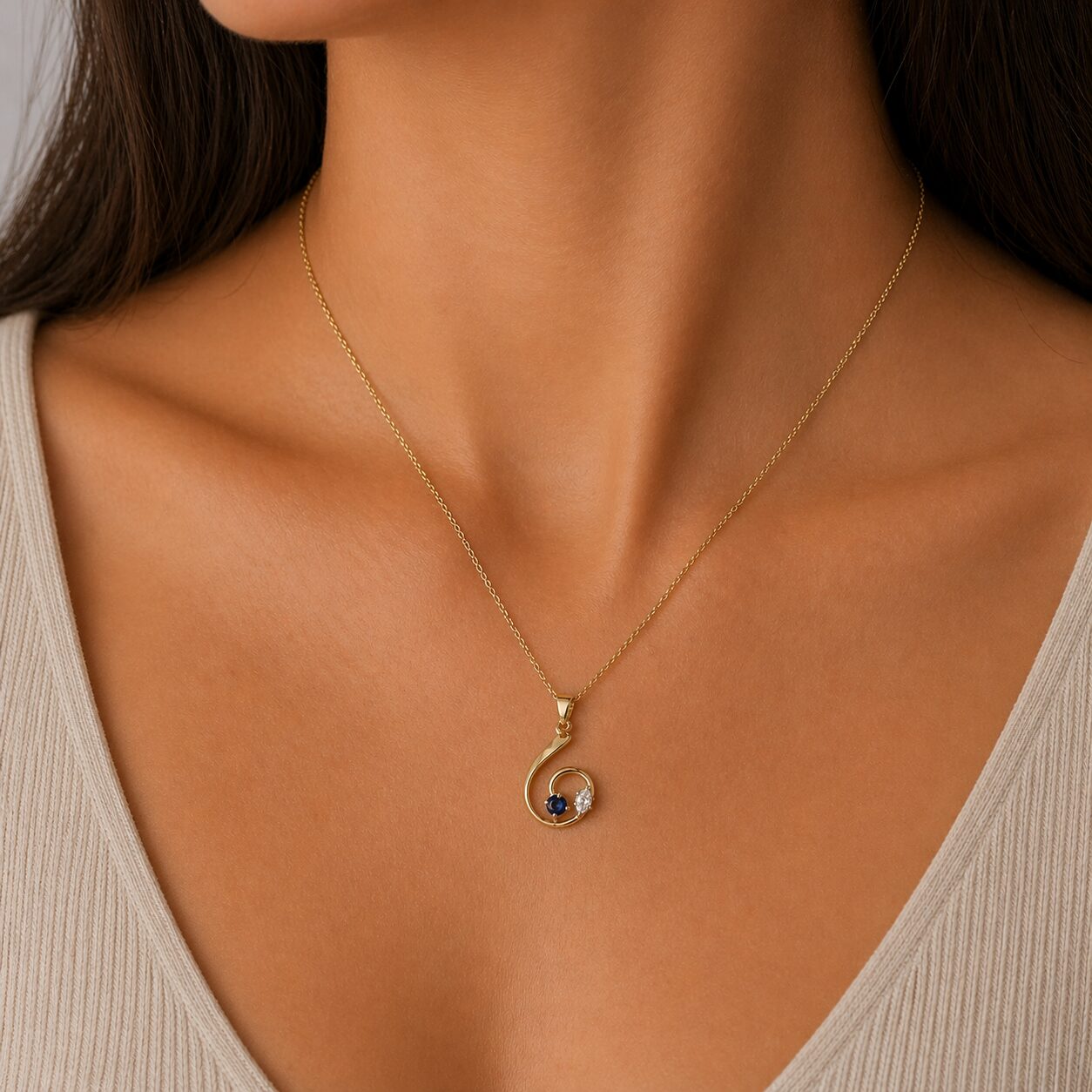 A bespoke one off pendant with an exquisite marquise diamond 0.25ct claw set in 18ct white gold with 0.52ct sapphire in white gold setting all nestled in a hand forged 18ct yellow gold u-shape pendant. A token of love, a lifetime of memories.