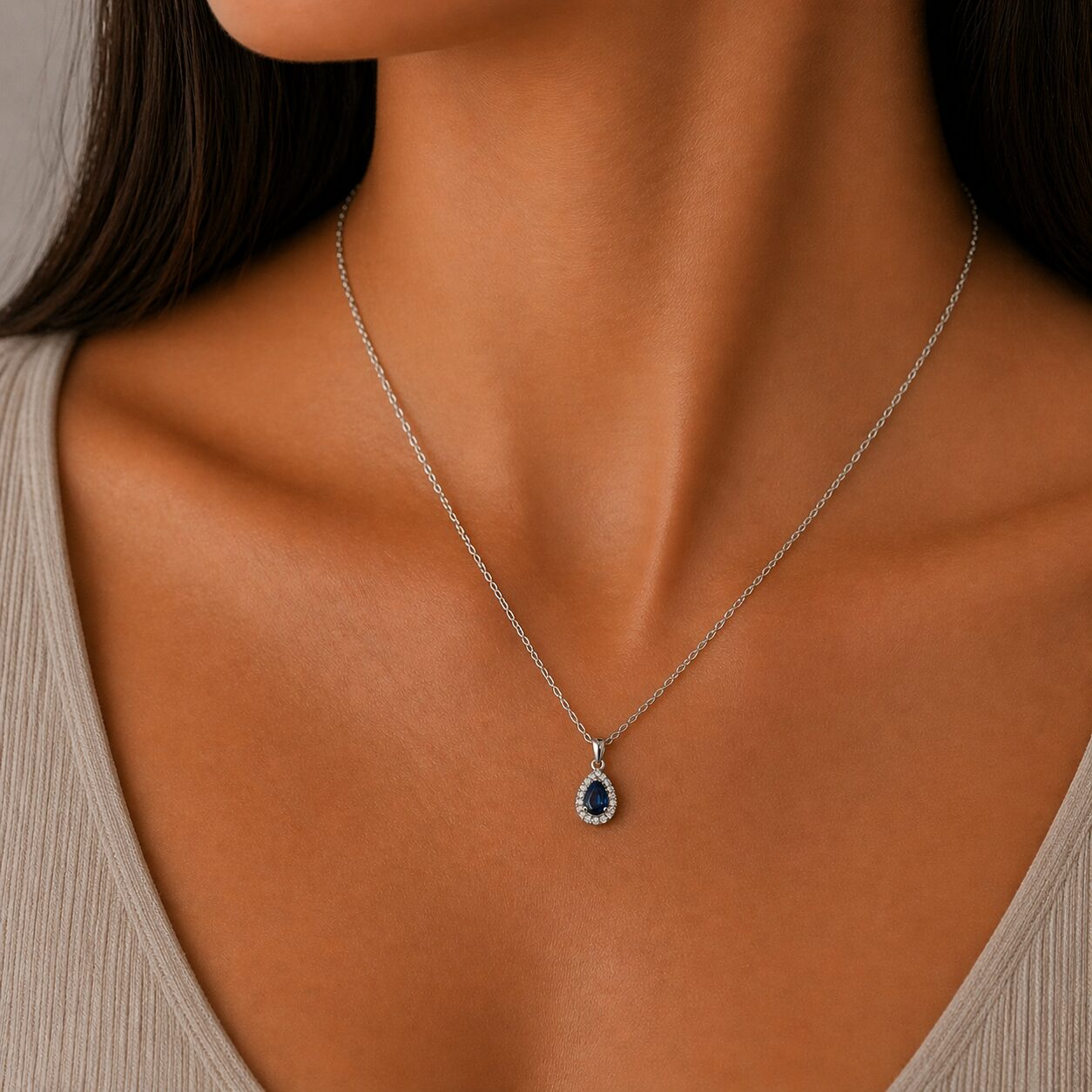 The pear-shaped sapphire and diamond cluster pendant, set in 18ct white gold, is a stunning masterpiece that exudes elegance and sophistication. Surrounding the 1.08ct sapphire is a cluster of dazzling diamonds, meticulously arranged to accentuate its graceful contours. These diamonds 0.14ct, carefully selected for their exceptional clarity and fire, form a radiant halo that enhances the brilliance of the central sapphire. The perfect gift for a significant birthday or anniversary.